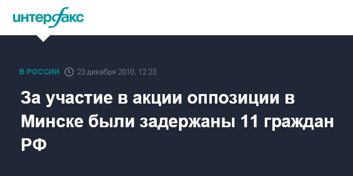 Минск. 23 декабря. INTERFAX.RU - Правоохранительными органами Белоруссии за участие в несанкционированной акции в Минске были задержаны 11 граждан Российской Федерации.