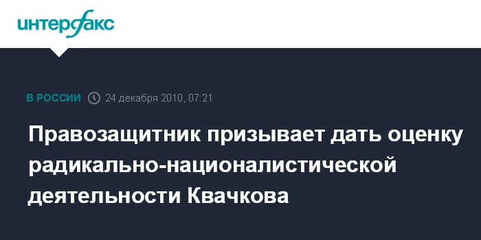 "Квачков - одна из опорных фигур радикального национализма в России. Он не скрывает своих ультра-националистических взглядов и печатает книги, не скрывает своих крайне радикальных планов и идей, которые идут в разрез с Конституцией", - сказал "Интерфаксу" директор Московского бюро по правам человека Александр Брод.