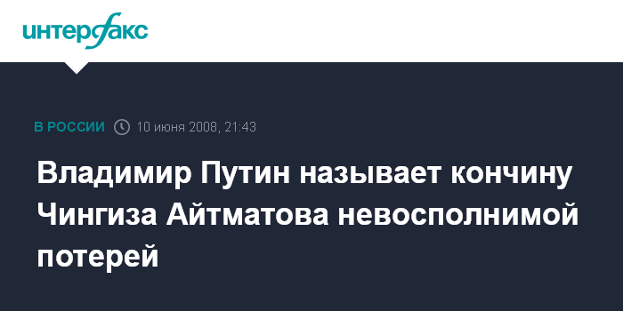 "Это большая невосполнимая потеря для всех нас. Чингиз Айтматов навсегда останется в нашей памяти великим писателем, мыслителем, интеллигентом и гуманистом", - говорится в телеграмме В. Путина.