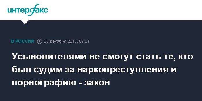После вступления закона в силу усыновителями, попечителями и опекунами не смогут стать граждане, судимые за похищение человека, за использование рабского труда, за преступления, связанные с наркотиками и психотропными средствами, за вовлечение в занятие проституцией, за организацию притонов и распространение порнографии.