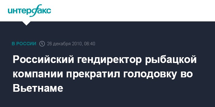Владивосток. 26 декабря. ИНТЕРФАКС-ДАЛЬНИЙ ВОСТОК - Генеральный директор компании "Antel Investments Ltd" Сергей Платоненко, который с 21 декабря проводил во Вьетнаме сухую голодовку в знак протеста против положения, в которое поставлены российские и иностранные работники группы компаний "Antel Seafood Group", прекратил акцию.