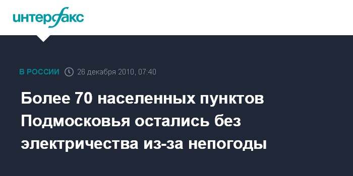 Москва. 26 декабря. ИНТЕРФАКС - Энергоснабжение 73 населенных пунктов Московской области нарушено из-за массового отключения электросетей, вызванного непогодой, сообщили "Интерфаксу" утром в воскресенье в ОАО "МОЭСК".