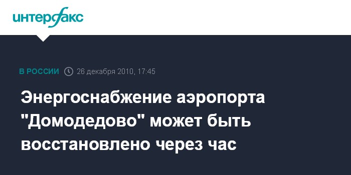 Москва. 26 декабря. INTERFAX.RU - Энергоснабжение аэропорта "Домодедово" может быть восстановлено через час-полтора, сообщил "Интерфаксу" источник в филиале МОЭСК - "Южные электросети".