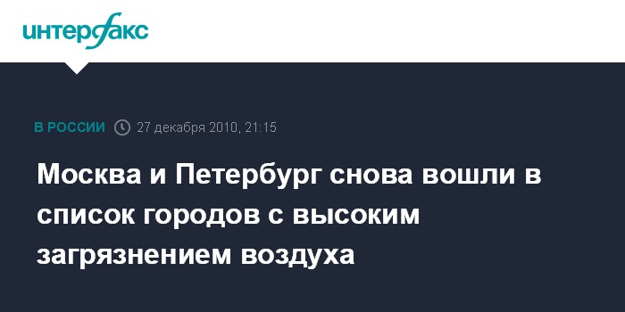 Москва. 27 декабря. INTERFAX.RU - Москва и Санкт-Петербург снова вошли в список городов с очень высоким загрязнением воздуха - все население этих городов живет в неблагоприятной экологической обстановке.