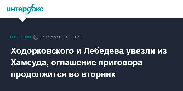 Москва. 27 декабря. INTERFAX.RU - Хамовнический суд Москвы во вторник продолжит оглашение приговора по второму делу в отношении экс-главы НК "ЮКОС" Михаила Ходорковского и бывшего главы МФО "Менатеп" Платона Лебедева.
