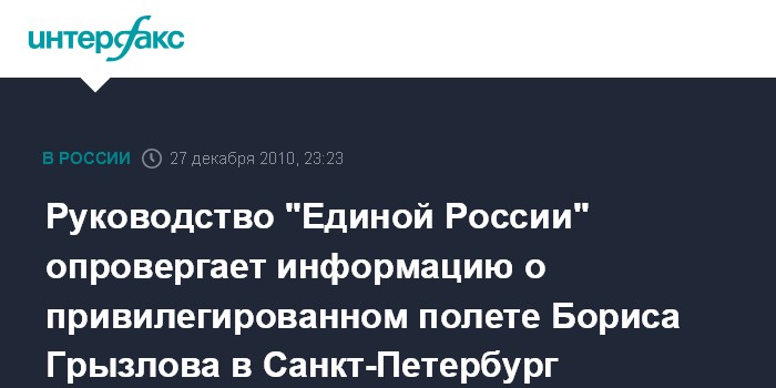 Москва. 27 декабря. ИНТЕРФАКС - В руководстве "Единой России" опровергли сообщения ряда СМИ, которые распространили информацию о привилегированном перелете из столичного аэропорта "Шереметьево" в Санкт-Петербург председателя Высшего совета партии, спикера Госдумы РФ Бориса Грызлова.
