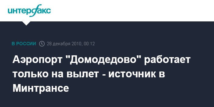 Москва. 27 декабря. ИНТЕРФАКС – Международный аэропорт "Домодедово" работает только на вылет. Прием воздушных судов временно приостановлен, сообщил журналистам источник в Минтрансе.