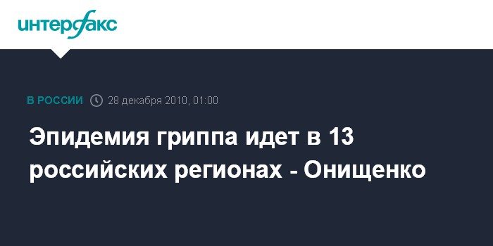 Москва. 28 декабря. ИНТЕРФАКС - В 13 российских регионах отмечена вспышка гриппа, сообщил "Интерфаксу" глава Роспотребнадзора, главный государственный санитарный врач РФ Геннадий Онищенко.