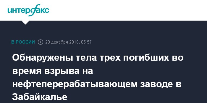 Чита. 28 декабря. ИНТЕРФАКС-СИБИРЬ - На нефтеперерабатывающем заводе в поселке Даурия Забайкальского края, где был потушен сильный пожар, обнаружены тела трех человек, сообщили агентству "Интерфакс - Сибирь" во вторник в единой диспетчерской службе Забайкальского края.