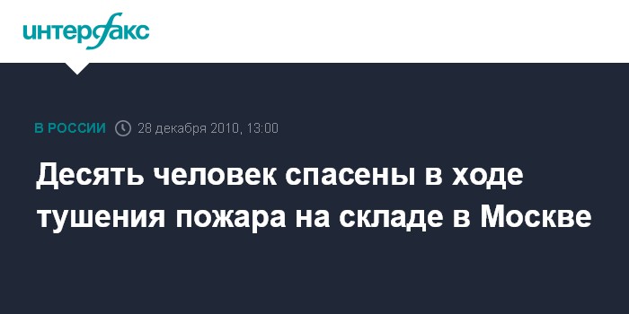 Москва. 28 декабря. INTERFAX.RU - На складе стройматериалов в Чермянском проезде Москвы, где во вторник утром произошел крупный пожар, обрушилась кровля на площади 1,5 тыс. квадратных метров, в ходе тушения были спасены 10 человек, сообщил "Интерфаксу" официальный представитель столичного МЧС Евгений Бобылев.