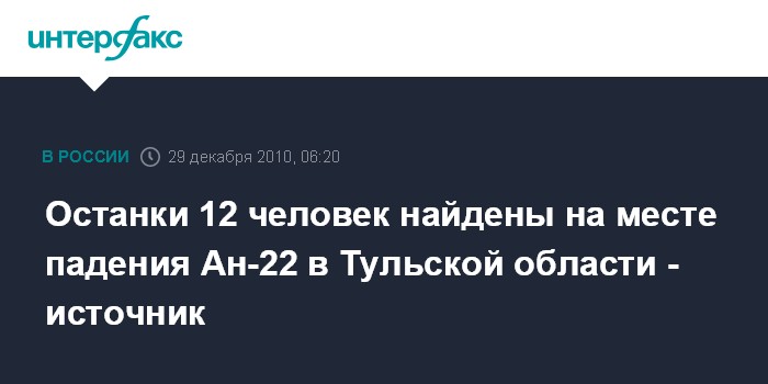 Москва. 29 декабря. ИНТЕРФАКС - Останки 12 человек найдены на месте падения военно-транспортного самолета Ан-22 в Тульской области, сообщил утром в среду "Интерфаксу" источник в силовых структурах.