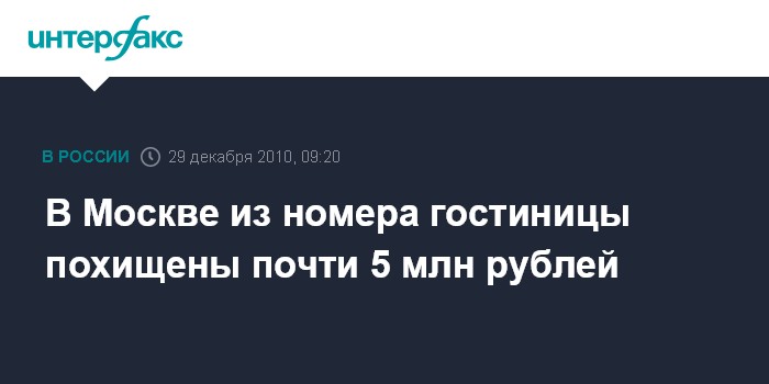Москва. 29 декабря. INTERFAX.RU - В Москве на Краснопресненской набережной из номера гостиницы "Краун Плаза" неизвестные похитили 4 млн 800 тысяч рублей.