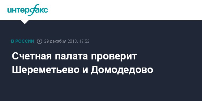 Москва. 29 декабря. INTERFAX.RU - Коллегия Счетной палаты РФ 14 января планирует рассмотреть вопрос о включении в план работы на 2011 год контрольных мероприятий, целью которых станет выявление эффективности использования средств федерального бюджета и федеральной собственности для организации воздушных перевозок в аэропортах "Домодедово" и "Шереметьево".