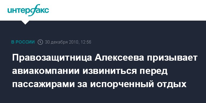"Многие пассажиры опоздали на очень серьезные мероприятия. У многих испорчен отдых, за который были заплачены большие деньги, и так далее. Дело здесь не в правах человека, а в том, что если компании предоставляют услуги, то они должны предоставлять их, а не мучить людей", - сказала Л.Алексеева "Интерфаксу" в четверг.