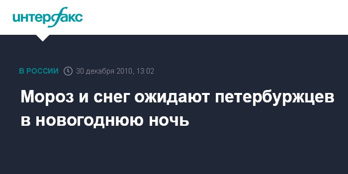 Санкт-Петербург. 30 декабря. INTERFAX.RU - Морозный воздух и небольшой снег прогнозируют синоптики в Петербурге и Ленинградской области 31 декабря и в ночь на 1 января. Как сообщили "Интерфаксу" в городском Гидрометцентре в четверг, в течение пятницы температура воздуха ожидается от 10 до 15 градусов мороза. В первый день нового года усилится ветер до 12 м/с, местами будут метели.