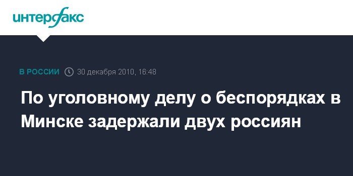 Минск. 30 декабря. INTERFAX.RU - Двое граждан России задержаны в рамках расследования уголовного дела о массовых беспорядках в Минске 19-20 декабря, сообщила агентству "Интерфакс-Запад" в четверг начальник управления информации и общественных связей МВД Белоруссии Светлана Боровская.