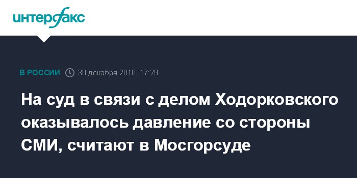 Москва. 30 декабря. INTERFAX.RU - Пресс-служба Мосгорсуда заявляет о давлении на Хамовнический суд со стороны средств массовой информации в связи с процессом по делу бывшего совладельца НК "ЮКОС" Михаила Ходорковского и экс-руководителя МФО "МЕНАТЕП" Платона Лебедева.