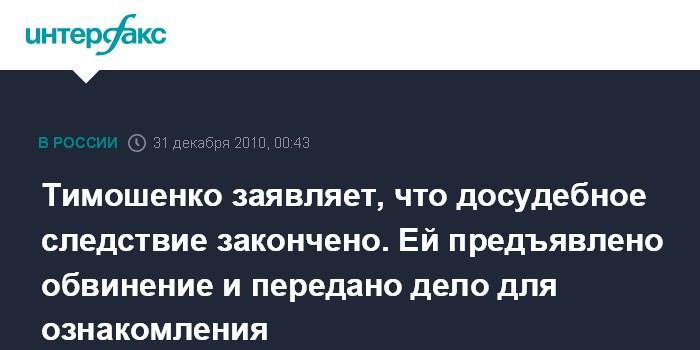 Тимошенко заявляет, что досудебное следствие закончено. Ей предъявлено обвинение и передано дело для ознакомления