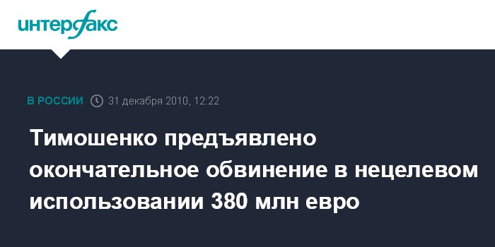 Тимошенко предъявлено окончательное обвинение в нецелевом использовании 380 млн евро