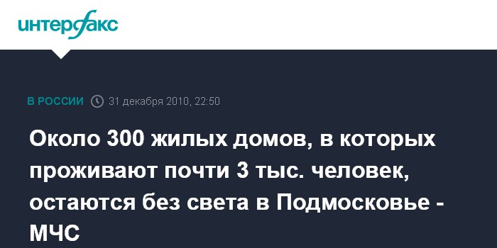 Москва. 31 декабря. ИНТЕРФАКС - По последним данным, почти 3 тыс. человек в Московской области остаются без электроснабжения, сообщили "Интерфаксу" вечером в пятницу в главном управлении МЧС России по Московской области.