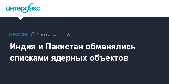 Лондон. 1 января. INTERFAX.RU - Исламабад и Дели, в соответствии с соглашением о ядерной безопасности в регионе, обменялись списками ядерных объектов, сообщает в субботу британская телерадиокорпорация Би-Би-Си. В начале каждого года дипломаты Индии и Пакистана передают друг другу списки ядерных объектов, чтобы предотвратить несанкционированные атаки на них. Первый обмен состоялся 1 января 1992 года.