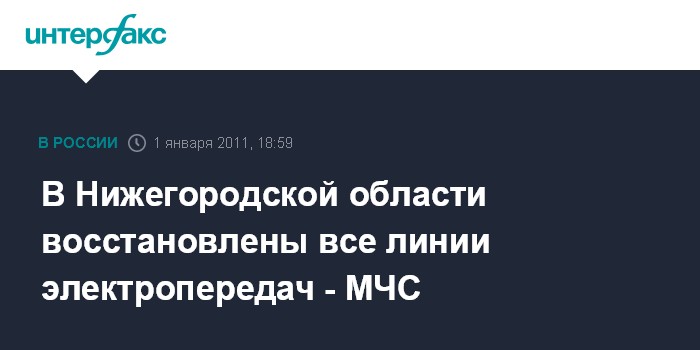 Москва. 1 января. INTERFAX.RU - По состоянию на 18:00 1 января все линии электропередач в Нижегородской области восстановлены, идет плановое подключение потребителей, сообщает ГУ МЧС России по Нижегородской области. "Пока не подключенными остаются 12 населенных пунктов, в которых проживает 1731 житель. На базе Центра управления в кризисных ситуациях МЧС России по Нижегородской области продолжает работу оперативный штаб во главе с губернатором Нижегородской области В.Шанцевым", - говорится в сообщении, размещенном на сайте ведомства.