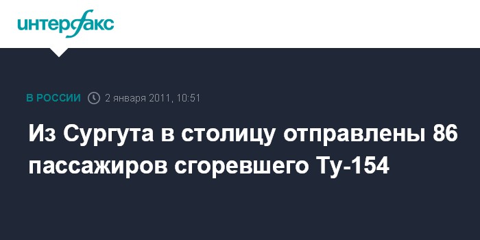 Сургут. 2 января. INTERFAX.RU - Из аэропорта Сургута в субботу вечером и утром воскресенья в Москву отправлены 86 пассажиров сгоревшего 1 января самолета Ту-154, сообщили агентству "Интерфакс-Урал" в пресс-службе главного управления МЧС России по ХМАО. "Часть из них выехали поездами. Таким образом, в Сургуте остаются только те, кому оказывается помощь. По данным на 9:00 2 января по местному времени, в больницах остаются 30 пострадавших", - сказал собеседник агентства.