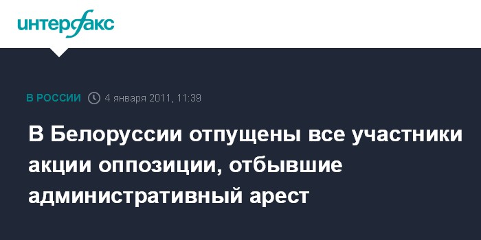 Минск. 4 января. INTERFAX.RU - Все участники несанкционированной акции оппозиции в Минске, которые отбыли административный арест, вышли из спецучреждений, сообщили агентству "Интерфакс-Запад" во вторник в министерстве внутренних дел Белоруссии. "Все, кто отбыл назначенный судами административный арест, вышли на свободу", - сообщили в МВД. Собеседник агентства напомнил, что "в минувший понедельник закончились 15 суток ареста у почти 150 человек, которые были задержаны 19-20 декабря в Минске".