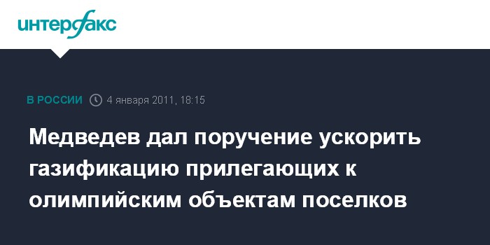 "Роза Хутор" (Краснодарский край). 4 января. INTERFAX.RU - Президент РФ Дмитрий Медведев во вторник в ходе совещания, посвященного постолимпийскому наследию Игр 2014 года, уделил внимание бытовым проблемам жителей прилегающих к строящимся олимпийским объектам населенных пунктов. В частности, он отметил, что в горных поселках Красная Поляна и Эсто-Садок до сих пор нет газа. "Я поручаю администрации Краснодарского края вместе с федеральными ведомствами и "Газпромом" заняться газификацией всей прилегающей местности, конечно, в разумные сроки", - сказал Д.Медведев