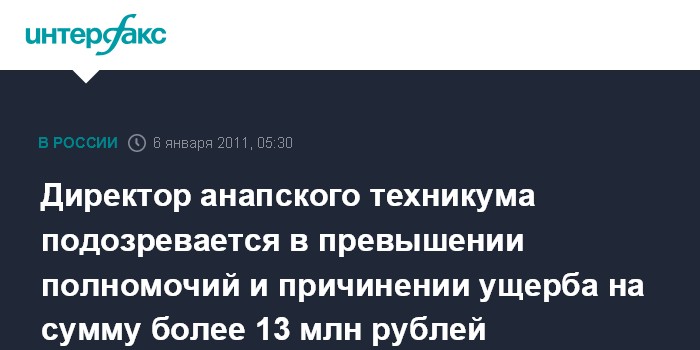 Краснодар. 6 января. ИНТЕРФАКС-ЮГ - На Кубани возбуждено уголовное дело в отношении директора ФГОУ СПО "Анапский сельскохозяйственный техникум" по признакам превышения служебных полномочий, повлекшего ущерб техникуму на сумму более 13 млн рублей, говорится в сообщении прокуратуры Краснодарского края.
