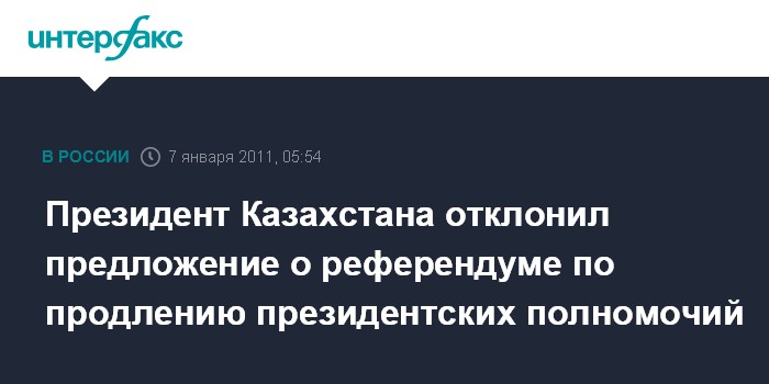 Алма-Ата. 7 января. ИНТЕРФАКС-КАЗАХСТАН - Президент Казахстана Нурсултан Назарбаев отклонил предложение парламента о вынесении на референдум изменений в Конституцию, предусматривающих продление полномочий первого президента страны.