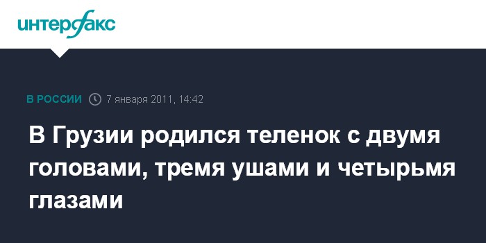 Тбилиси. 7 января. INTERFAX.RU - В Мартвильском районе Грузии произошел аномальный случай - корова родила двухголового теленка. Как сообщают грузинские СМИ, у теленка две головы, три уха и четыре глаза.
