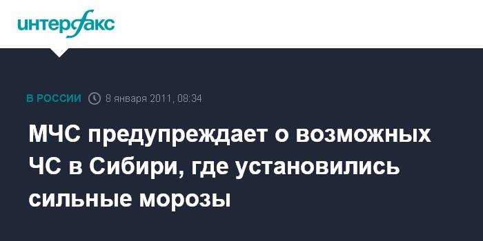 Чита. 8 ноября. ИНТЕРФАКС-СИБИРЬ - Сибирский региональный центр МЧС в связи с сильными морозами предупреждает о возможном возникновении чрезвычайных ситуаций в семи сибирских регионах.