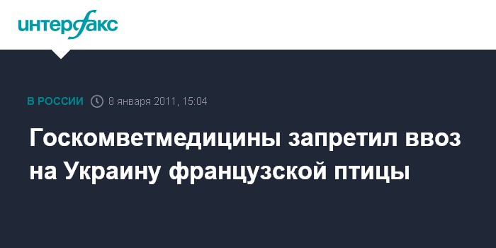 Киев. 8 января. INTERFAX.RU - Государственный комитет ветеринарной медицины Украины запретил ввоз в страну из провинции Бретань Республики Франция птицы, продукции и сырья из нее. Соответствующее решение было подписано 6 января и опубликовано на официальном сайте Госкомветмедицины. Причиной такого решение стало официальное сообщение Международного эпизоотического бюро, согласно которому на территории департамента Кот-д‘Армор региона Бретань у птиц была зарегистрирована болезнь Ньюкасла.