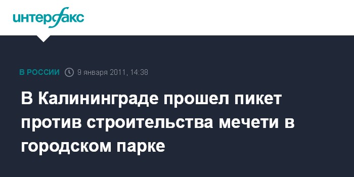 Калининград. 9 января. INTERFAX.RU - В Калининграде жители Московского района провели очередной - третий пикет протеста против строительства мечети в городском парке "Южный". В акции протеста, разрешенной администрацией города, приняло участие около 100 человек. Пикет традиционно прошел у входа в парк "Южный" рядом с местом, где началось строительство мечети.