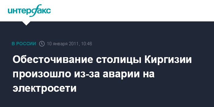 Бишкек. 10 января. INTERFAX.RU - Обесточившая Бишкек 8 января авария произошла из-за высокой нагрузки в электросетях, сообщил на пресс-конференции в понедельник заместитель министра энергетики КР Автандил Калмамбетов. Одной из главных причин аварии на подстанции "Фрунзенская", находящейся в пригороде Бишкека, стала перегрузка электросетей, - пояснил он.