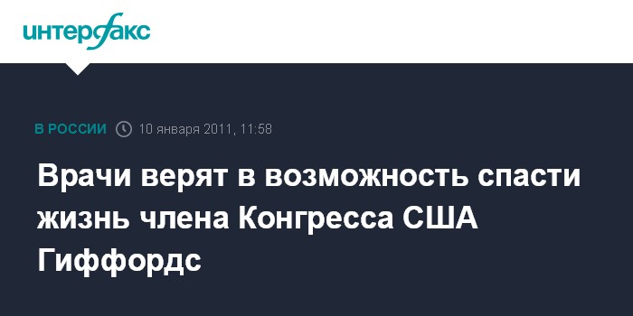 Вашингтон. 10 января. INTERFAX.RU - Член Палаты представителей США от демократов Габриэль Гиффордс вполне может выжить после полученного пулевого ранения в голову, сообщает в понедельник газета "Вашингтон пост" со ссылкой на американских медиков. Врачи, следящие за состоянием здоровья Г.Гиффордс, подчеркнули, что пуля относительно слабо задела мозг, а пациентка, продолжающая борьбу за жизнь, уже в состоянии реагировать на происходящее вокруг нее.