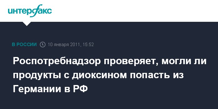 По данным Роспотребнадзора, в 2010 году в Германии произошло загрязнение диоксином корма для животных, поставлявшегося на птице- и свинофермы, и как следствие, пищевых продуктов - мяса птицы, мясных изделий, животных жиров, куриных яиц, произведенных в фермерских хозяйствах в земле Нижняя Саксония на северо-западе ФРГ. "В настоящее время Федеральной службой по надзору в сфере защиты прав потребителей и благополучия человека выясняются обстоятельства произошедшего инцидента и возможные пути поступления такой продукции в Россию", - сообщили в Роспотребнадзоре.
