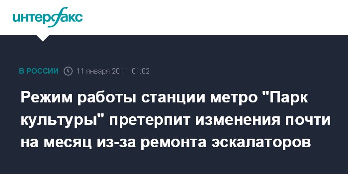 Москва. 11 января. ИНТЕРФАКС-МОСКВА - С 11 января по 5 февраля в связи с выполнением работ по ремонту эскалатора изменяется режим работы перехода между станциями "Парк культуры" Сокольнической и Кольцевой линий московского метро.