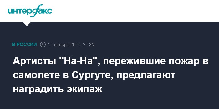 Москва. 11 января. INTERFAX.RU - Группа "На-На" обратилась к президенту РФ Дмитрию Медведеву с просьбой наградить членов экипажа сгоревшего в аэропорту Сургута самолета Ту-154, рисковавших жизнью для спасения пассажиров.