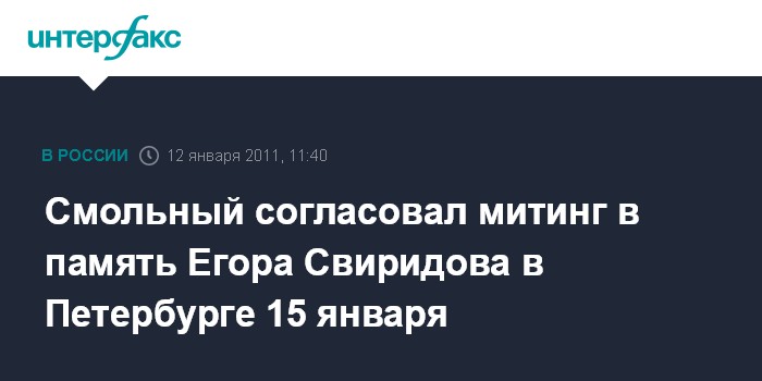 Санкт-Петербург. 12 января. INTERFAX.RU - Власти Петербурга согласовали заявку на проведение митинга 15 января в память убитого в Москве футбольного болельщика Егора Свиридова.