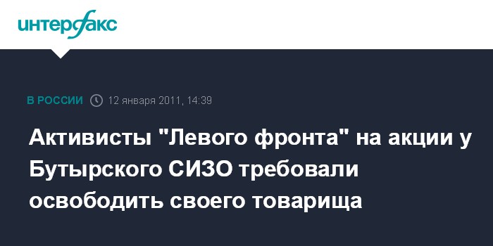 Москва. 12 января. INTERFAX.RU - Акция в поддержку сторонника оппозиционного движения "Левый фронт" Григория Торбеева, которому инкриминируют применение насилия в отношении милиционера после задержания на "Дне гнева" в ноябре, состоялась в среду у Бутырского СИЗО.