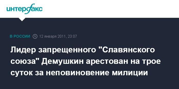 Москва. 12 января. ИНТЕРФАКС - Лидер запрещенной националистической организации "Славянский союз" Дмитрий Демушкин получил трое суток административного ареста за сопротивление милиции 11 января на Манежной площади.