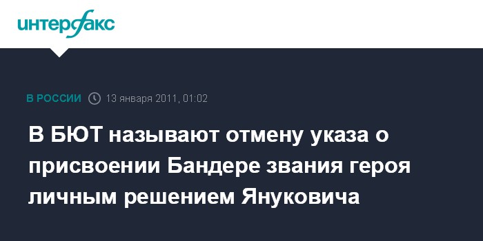 Киев. 13 января. ИНТЕРФАКС-УКРАИНА - Признание недействительным указа президента о присвоении звания Героя Украины Степану Бандере является политическим, а не юридическим решением, заявляют в пресс-службе Блока Юлии Тимошенко (БЮТ) и партии "Батькивщина".