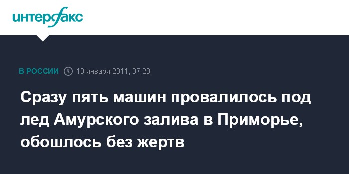 Владивосток. 13 января. ИНТЕРФАКС-ДАЛЬНИЙ ВОСТОК - Пять автомобилей провалились в трещину на льду Амурского залива близ Владивостока и ушли на дно.