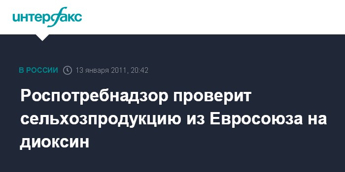Москва. 13 января. INTERFAX.RU - Роспотребнадзор проверит на предмет наличия диоксина продукцию животного происхождения, которая поступила с декабря в Россию из ЕС, сообщили "Интерфаксу" в четверг в пресс-службе ведомства.