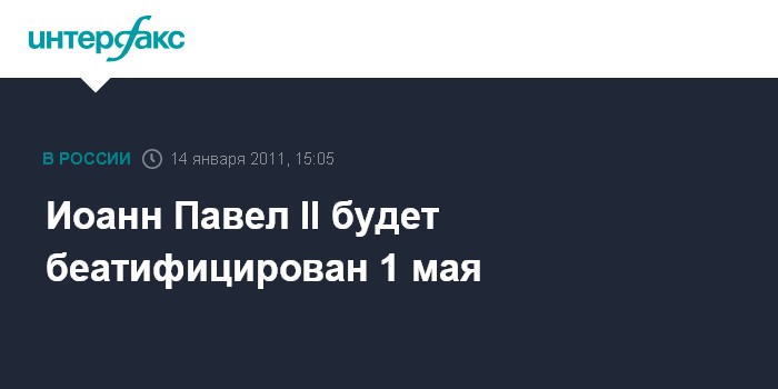 Рим. 14 января. INTERFAX.RU - Покойный папа римский Иоанн Павел II будет причислен к лику блаженных 1 мая 2011 года, сообщает в пятницу Ватикан.