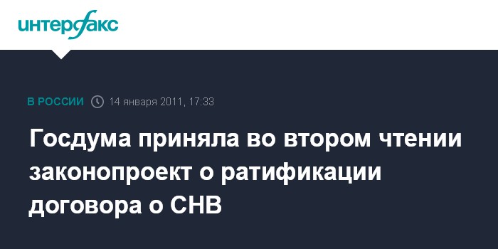 Москва. 14 января. INTERFAX.RU - Госдума в пятницу приняла во втором чтении внесенный президентом РФ законопроект о ратификации нового российско-американского договора о СНВ.