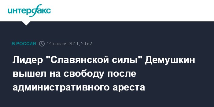 Москва. 14 января. INTERFAX.RU - Лидера националистического движения "Славянская сила" Дмитрия Демушкина выпустили из спецприемника, где он отбывал административный арест за попытку проведения акции на Манежной площади 11 января.