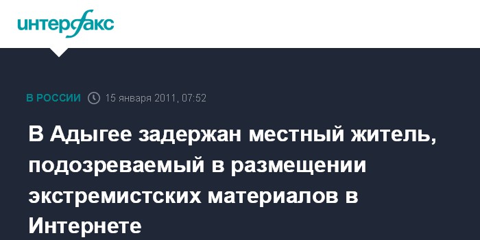 Ростов-на-Дону. 15 января. ИНТЕРФАКС-ЮГ - Задержан житель Майкопа, подозреваемый в публикации в сети Интернет материалов, в которых содержались призывы к экстремизму и осуществлению террористической деятельности, сообщили агентству "Интерфакс-Юг" в правоохранительных органах Адыгеи.